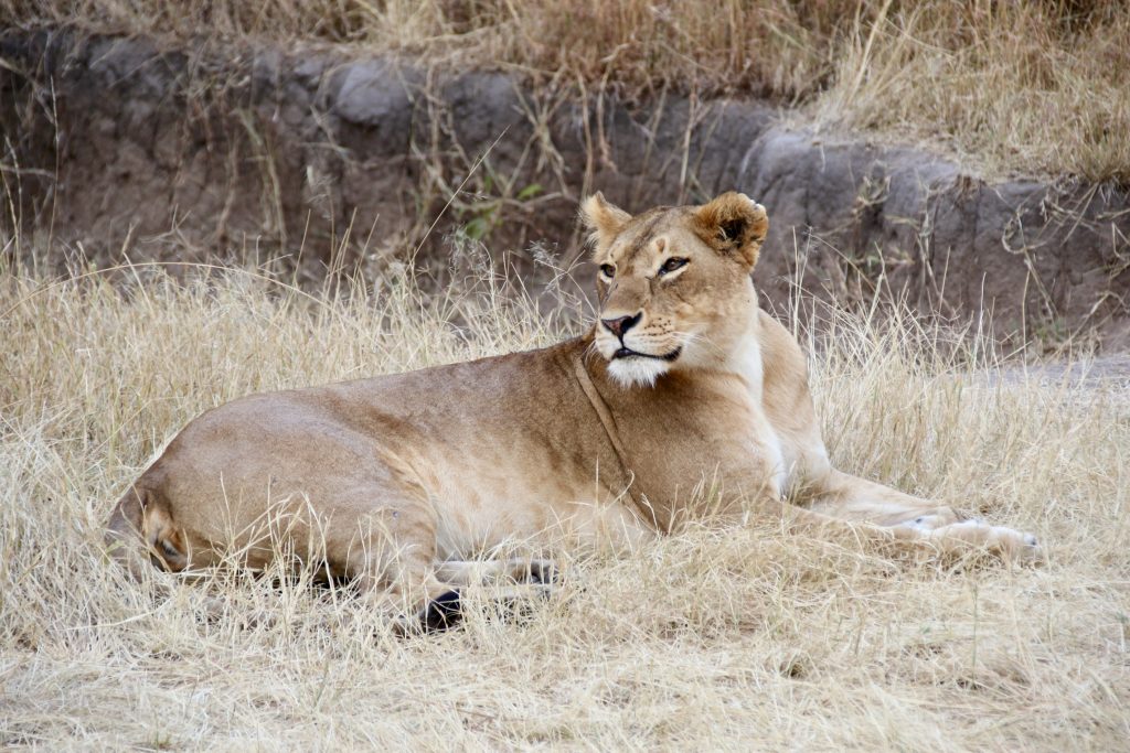 The Masai Mara National Reserve is approximately 20 miles wide and 10 miles north to south, bounded by the Tanzania border to the south. Over 6 drives we see all sorts of amazing behaviour: two lionesses in a river gully unaware that a leopard was eating their kill nearby; a grumpy bull elephant who would not budge from the track, forcing us to reverse and head elsewhere; a lion cub waiting patiently for its parents to come back; another playfighting with his father’s tail; a pride of lions seeing off an unwanted rival lioness; hyena loping along tracks with various items they had scavenged; small scrub hare scuttling off the track at dawn or dusk; a blue and red lizard in a dry river bed; and endless lines and herds of wildebeest, buffalo and zebra.