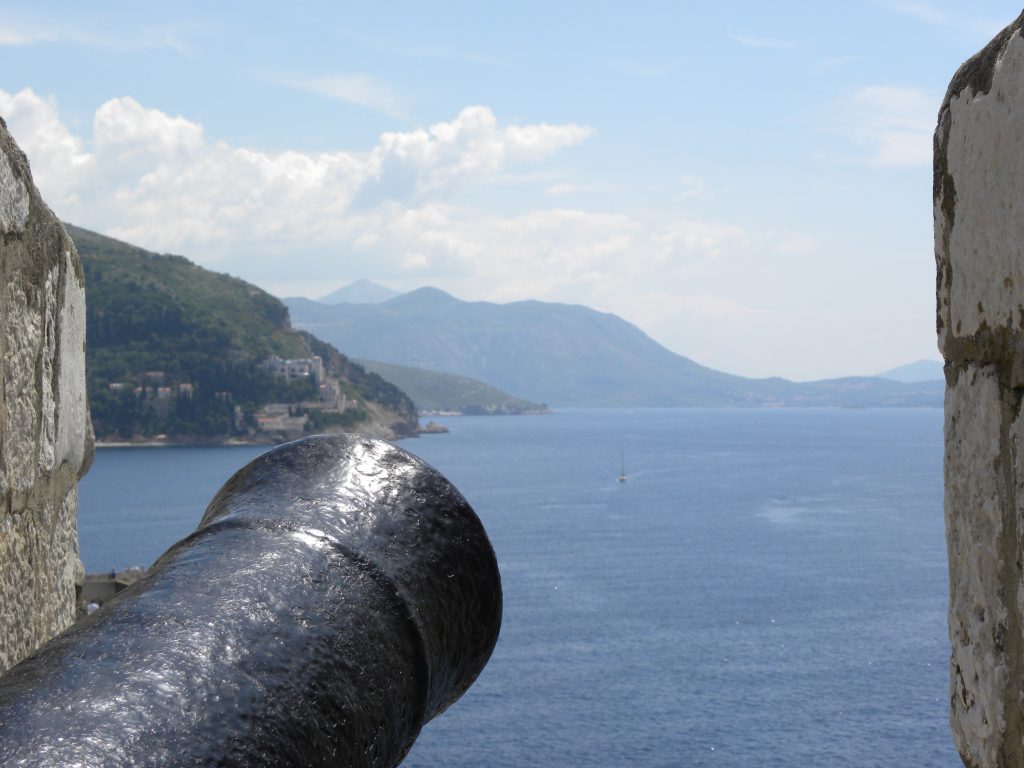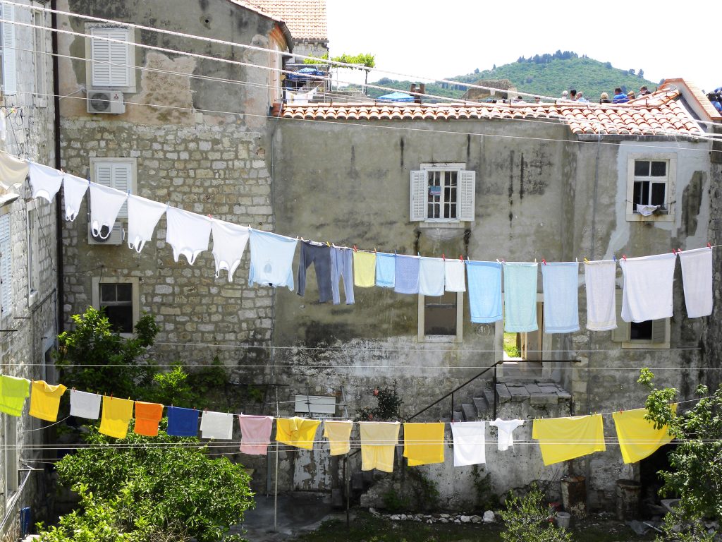 The next day it was time for a proper exploration of the old town. In glorious sunshine we buy tickets to walk the high city walls. The disclaimer on the ticket points out in very small print that the association is not responsible for visitors accidents. This is not surprising given the perilous steps up and the roving gangs of unsteady pensioners spewing out of cruise ships and invading this tiny old town. Thin parapets provide frequent bottlenecks as unaware Japanese students insist on taking endless photos and blocking the way for everyone else. The view out to sea is charming, but it is looking in that is arguably more interesting. In a slightly voyeuristic way, one can look down from on high into gardens and schools. Colourful laundry hangs from lines suspended high on the walls, and significant construction in this tight space shows how difficult it must have been to rebuild after the siege in 1991. 600 shells hit the old town in one day that year.