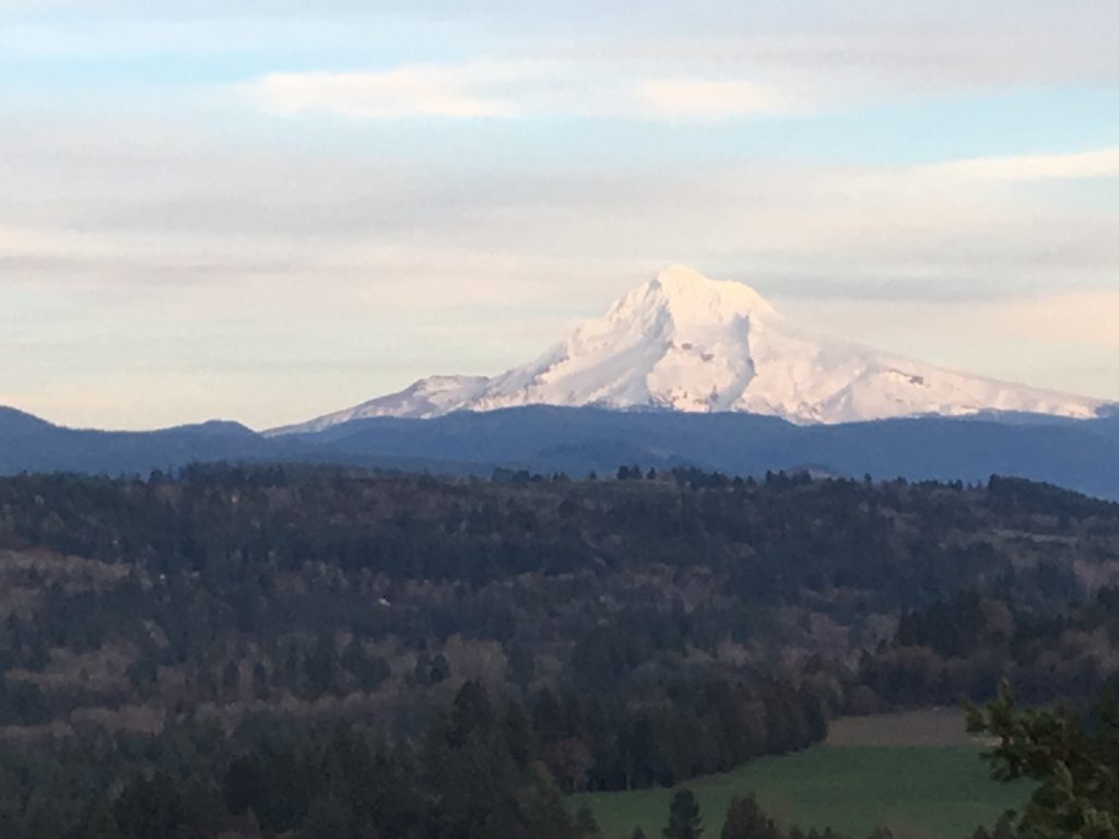 Moving on, we visit Rowena Crest at the east end of the gorge where most of the vegetation has disappeared because it is in the rain shadow. There is a fish hatchery where salmon and sturgeon are nurtured. One old sturgeon here is over 75 years old. They can live to 100 apparently. We work our way up river to the fantastic Mount Hood – which looks better and better as we approach. The weather is on our side, and on the way we can see in the distance various huge mountains, including Mt. St. Helens, Mt. Adams, and Mt. Jefferson. On Mt. Hood we visit the iconic Timberline Lodge, which is packed with skiers, snowboarders, and of course, a wedding party (it’s Saturday). The bride and groom are freezing as they pose for photos outdoors. It’s been a great day, and given the heavy cloud cover for the previous few days, a very privileged one.