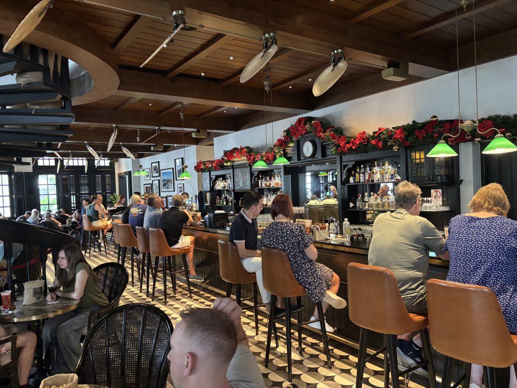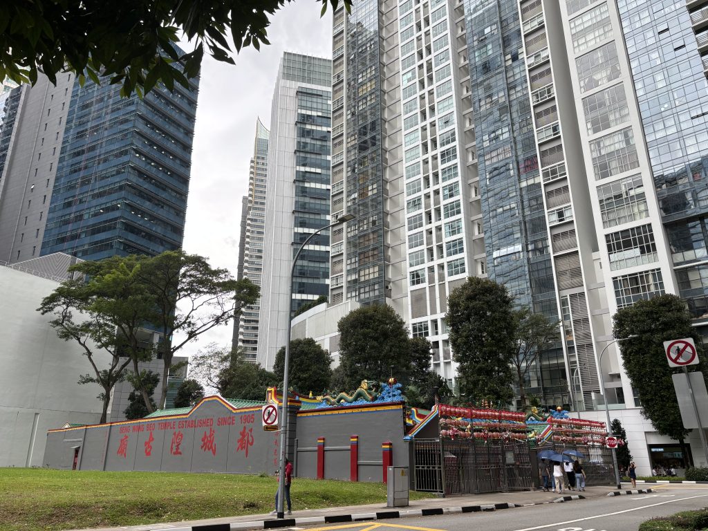 I walked a few blocks to Raffles to discover that the famous Long Bar had been unsympathetically refurbished and now looks like any normal pub. It was full, with people waiting outside to get in at 11.20 in the morning. Walking here is somewhat more time consuming than in many other cities because of their strict jaywalking rules and the manner in which traffic lights tend to favour cars over pedestrians. You can walk a huge block and then wait five minutes to cross the road. My route took me down past the Padang, home of the Singapore Cricket Club, the classic Victoria Theatre, crossing the river past the majestic Fullerton Hotel, through the congested financial centre and down Cecil Street to downtown. Something striking on such a stroll is the total absence of any street level shops or bars – everything is a tower block or a plaza, and the plazas are pretty horrible inside – stinky and congested. I return to my hotel, which from street level resembles a towering orange and green phallus, and I discover with horror that it completely dwarfs a charming ground level temple that was built in 1905. How planning permission was granted is a complete mystery. I have a well-earned beer next to a brilliantly named dental practice called Toof Doctor and retire for lunch.